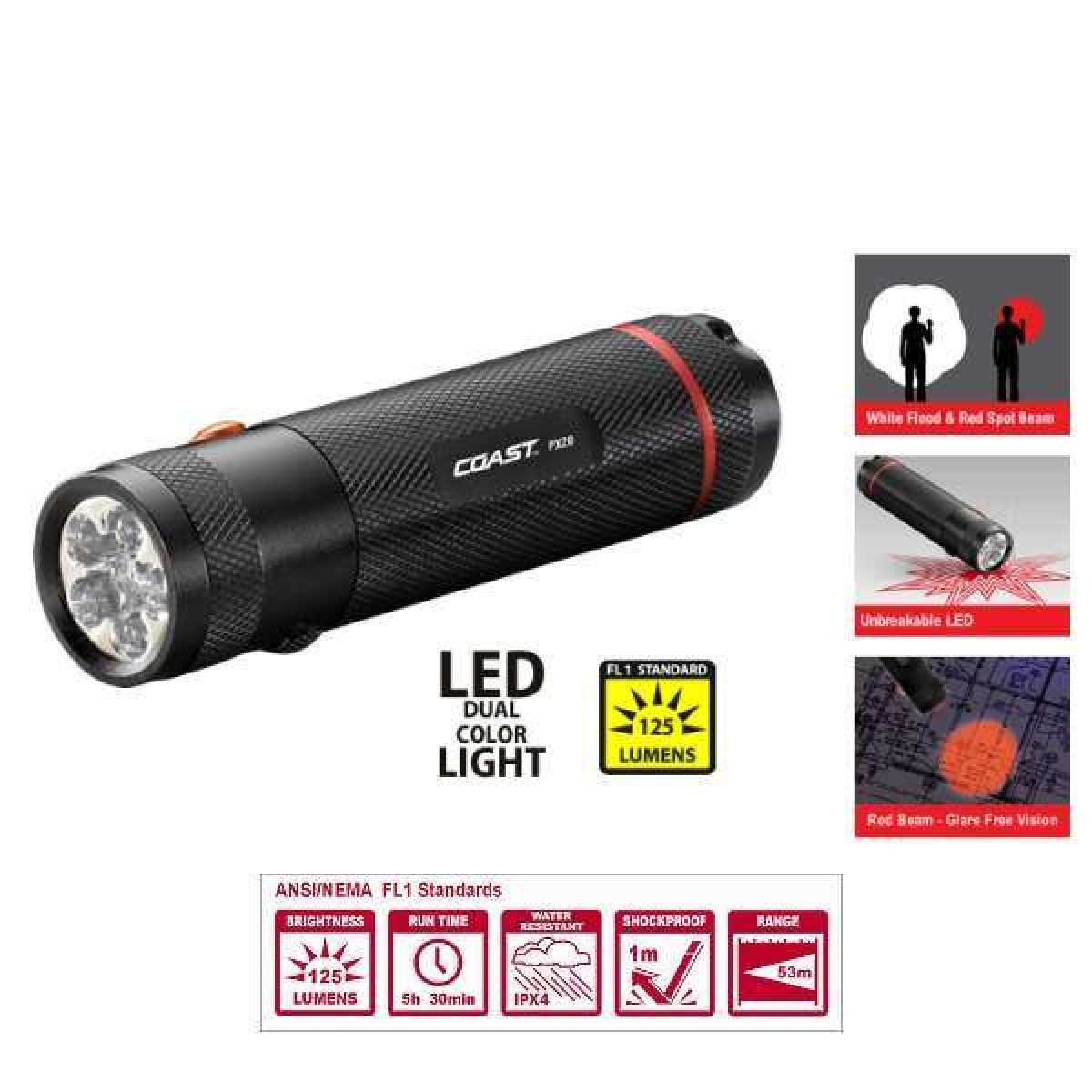 Червоний світлодіод забезпечує мінімальну кількість світла, необхідне для читання карти на полюванні або при астрономічних спостереженнях. Червоне світло не рарушает нічного зору. Білі ж створюють потужний потік світла, який може освітити досить великий простір. Легкий, ударостійкий алюмінієвий корпус анодований покриттям чорного кольору. Анодування Type II товщиною до 25 мікрон забезпечує відмінні експлуатаційні і діелектричні властивості і протистоїть корозії. Ліхтар Coast PX20 (125 Lm) протестований незалежною лабораторією і відповідає стандартам ANSI/FL1. У конструкції передбачено ущільнювальне кільце, яке забезпечує високий рівень вологостійкості і довговічності.