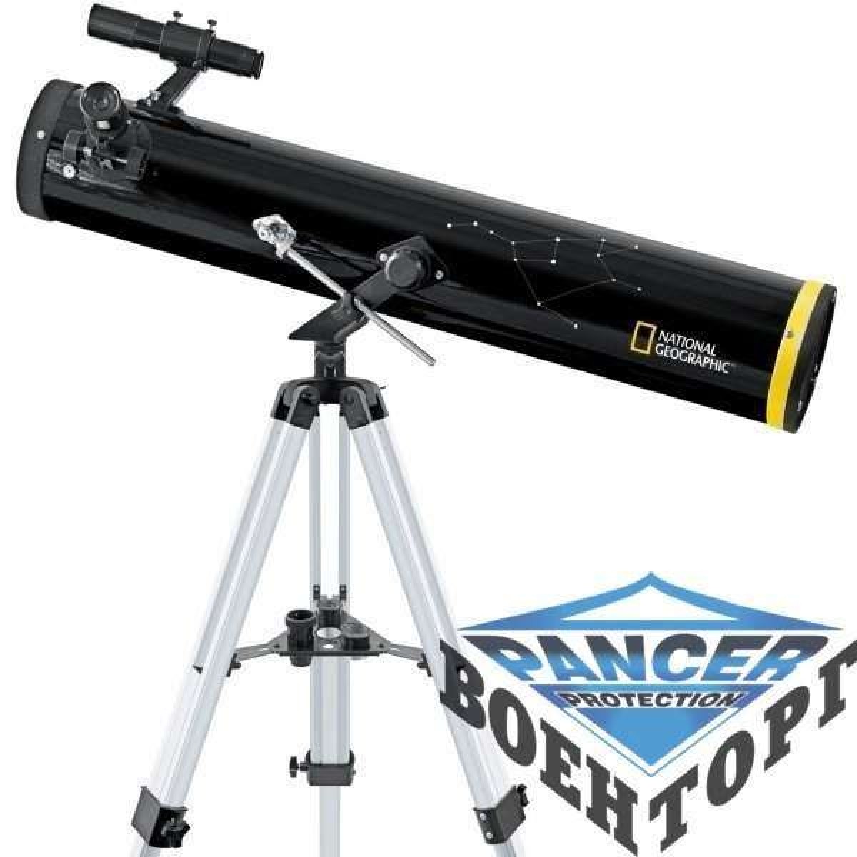 Телескоп National Geographic 114/900 Reflektor AZ – класичний дзеркальний телескоп, який володіє всіма перевагами рефлектора системи Ньютона. Його дзеркальний об'єктив будує зображення, повністю вільний від хроматичної аберації (колірного фарбування) – недоліку, властивого телескопів інших оптичних систем. Якісна оптика цього телескопа гарантує захоплюючі види місячної поверхні, хмарних поясів Юпітера з його світлими і темними поясами і системою супутників, кілець Сатурна, полярних шапок Марса, фаз Меркурія і Венери, величезної кількості подвійних і змінних зірок і найбільш яскравими зоряними скупченнями, туманностями і галактиками.