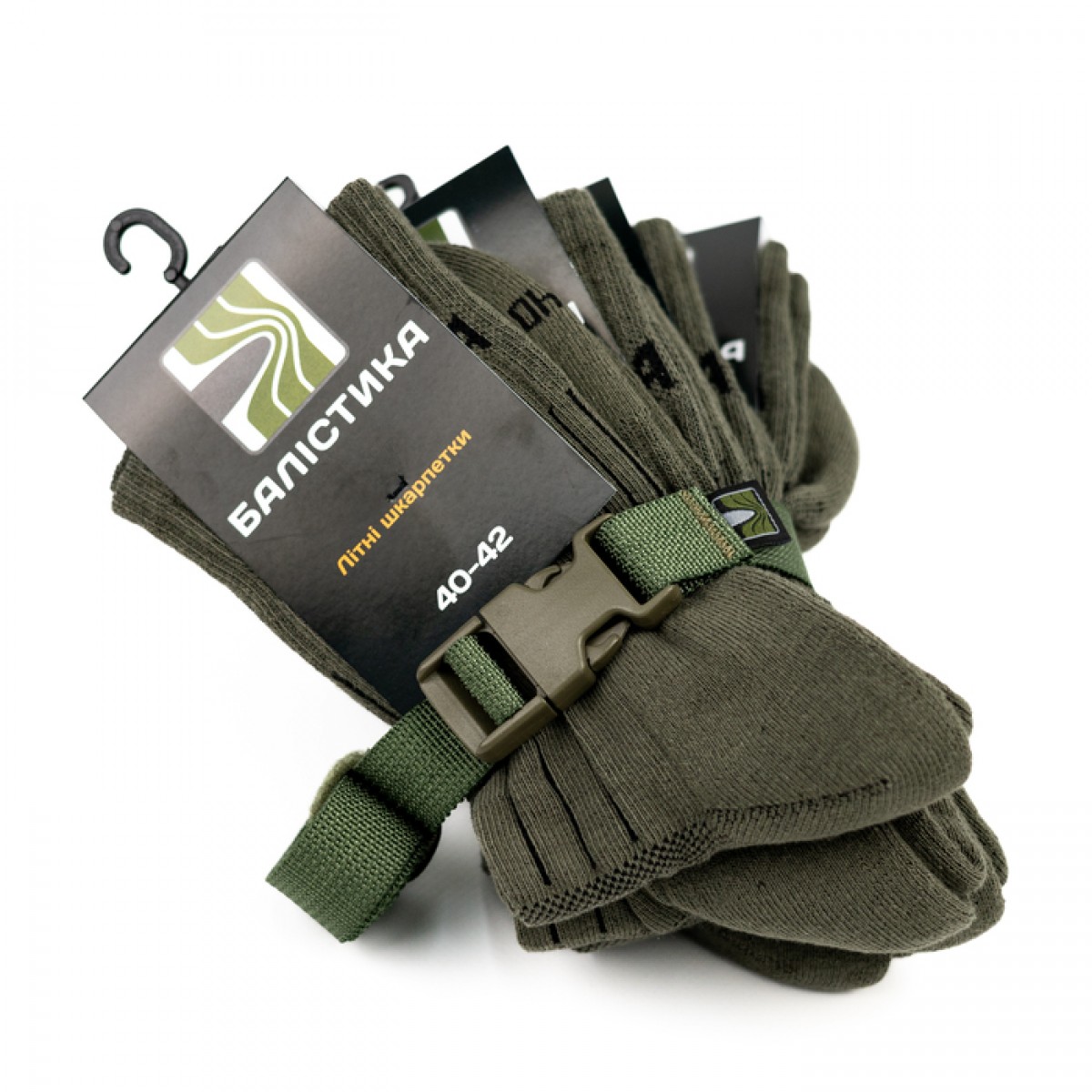 Одним із найважливіших факторів продуктивності для військового є комфорт ніг. Тому не варто недооцінювати вибір якісних шкарпеток, які здатні суттєво вплинути на загальне самопочуття і витривалість. Літні шкарпетки від «Балістики» розроблені й протестовані для використання в складних польових умовах. Завдяки збалансованому складу та особливому плетінню вони забезпечують потовідведення, підтримують оптимальну температуру, запобігають натиранням і мозолям. Особливості товару До переваг наших трекінгових шкарпеток належать такі: Бавовна забезпечує м’якість та повітропроникність, поліамід надає міцність та зносостійкість, а еластан гарантує гарне прилягання до ноги. Зони з найбільшим навантаженням – п’ята та мисок – зміцнені нейлоновою ниткою для протидії протиранню. А отже, шкарпетки прослужать довше. Широка фіксувальна резинка з посиленим подвійним бортом сприяє щільній посадці на гомілці та запобігає сповзанню шкарпеток. Наявні кілька зон вентиляції для кращої терморегуляції та зручний поперечний бандаж для надійної фіксації на стопі. Амортизаційне махрове плетіння на ступні поглинає удари під час ходи чи бігу, а це зменшує втомлюваність ніг. Ці шкарпетки трішки нижчі штатних, що видаються бійцям ЗСУ, тож не так передавлюють та стискають гомілку. Спеціально розроблені під статутне літнє взуття «Талани». Вигідна пропозиція! Ви можете придбати зручні набори по чотири пари, скріплені стропою олива; стропа в подарунок. Увага! Колір стропи може змінюватись в залежності від наявності на складі Технічні характеристики Склад: 78% – бавовна; 17% – поліамід; 5% – еластан. Сезонність: літні. Призначення: військові, туристичні. Кількість у наборі: 4 пари.Відгуки про Шкарпетки трекінгові "Балістика" комплект 4 пари 40-42