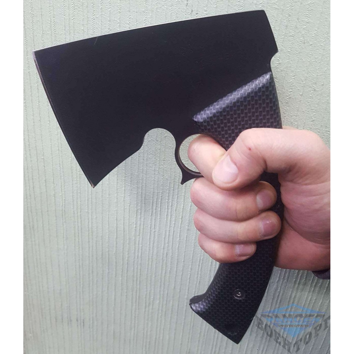 Сокира виконаний з легованої конструкційної сталі, створеної для потреб авіації – 30ХГСА. Вона стійка до корозії, ударів і володіє помірною в'язкістю. Рукоять з фанери може бути проклепана або бути розбірний, на посадженій нержавіючі торксы, а також мати аквапринт. Шкіряні піхви на застібці йдуть в комплекті.
