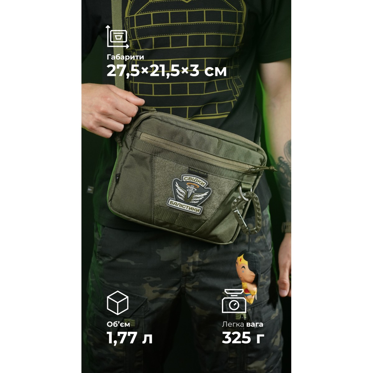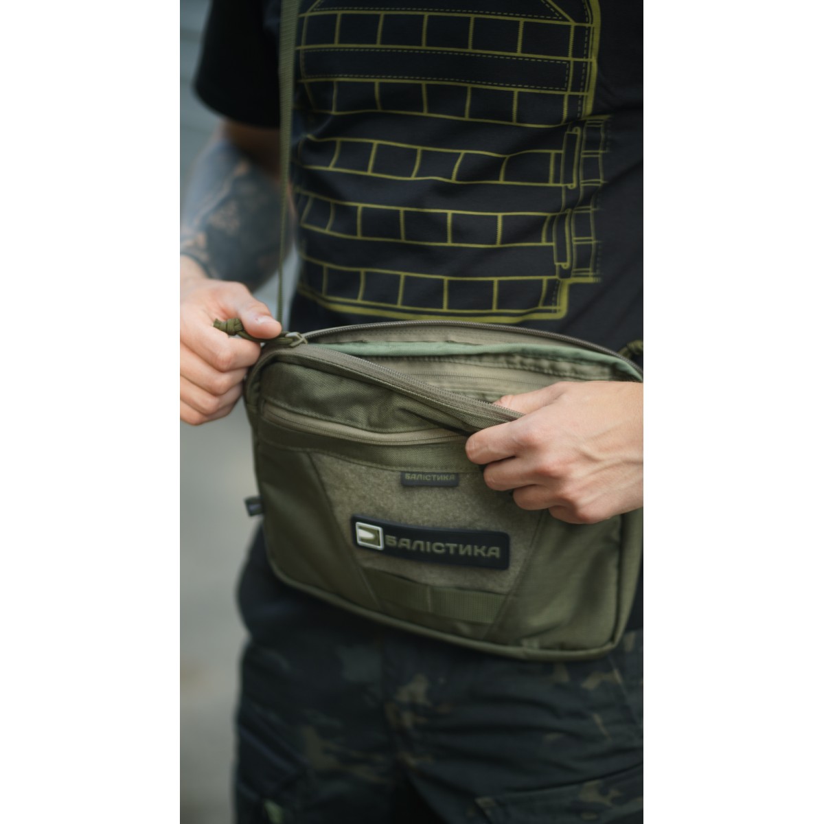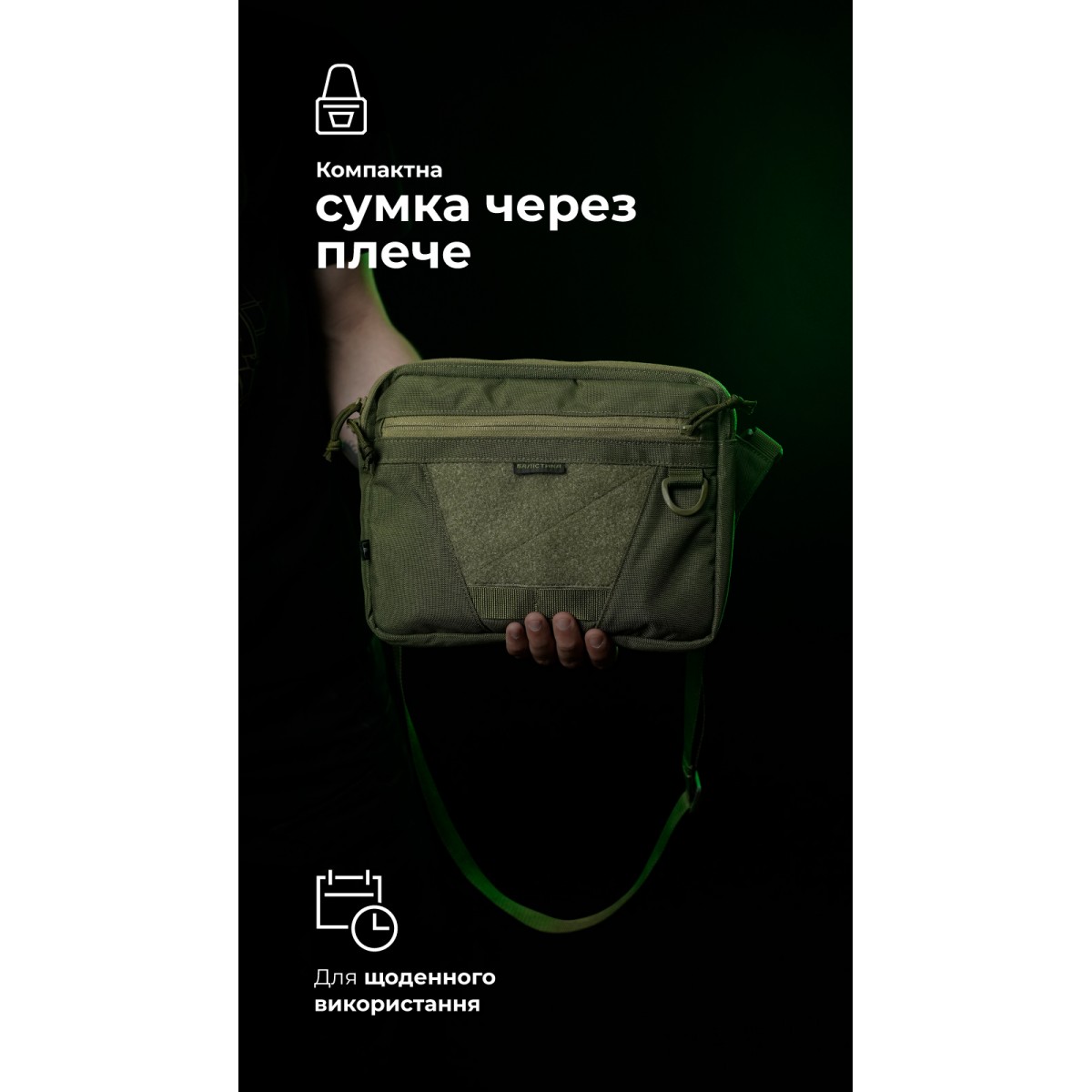 Компактна сумка через плече для щоденного носіння ✅ Ключові переваги Три відділення на блискавках для зручної організації речей Регульований ремінець із фастексом Потрійний доступ до заднього відділення Прозора кишеня з 2D-сітки Тренчик з карабіном для ключів Еластична манжета для мультитулів, ножів або ліхтариків Внутрішня велкро-панель для знімних органайзерів чи кобури Зовнішня велкро-панель для патчів D-кільце для підвісу аксесуарів Опис товару Тонка і легка сумка «Ташка» підійде для активних пересувань та перенесення найнеобхідніших дрібних речей. Складається з трьох відділень на блискавках. У передньому (27,5×20 см) є дві відкриті кишені (по 13×10 см). Також тут вшитий тренчик із карабіном – для кріплення ключів, перепусток тощо. Середнє, об’ємне відділення (27,5×21,5×3 см) оснащене прозорою кишенею (26×20 см) з 2D-сітки на передній стінці. Відділення замикається блискавкою з двома бігунками. ✔️ Над сітчастою кишенею розташована еластична манжета, у яку можна вкласти мультитул, складний ніж, ліхтарик або турнікет. ✔️ На задній стінці нашита велкро-панель (25,5×15,5 см), призначена для знімних органайзерів, кобур або тримачів, наприклад під газовий балончик. ✔️ Над панеллю вміщена блискавка, яка відкриває заднє відділення. Заднє відділення (26,5×21 см) зовні по краях оснащене ще двома вертикальними блискавками. Подвійний зовнішній доступ дає змогу швидко і легко діставати потрібні речі однією рукою (скажімо, телефон), навіть сидячи за кермом. ✔️ Сумка доповнена ремінцем зі стропи, який вшитий у бокові «крильця» під кутом – для зручнішого носіння через плече. Ремінець обладнаний фастексом для швидкого зняття та регулюється за довжиною. ✔️ На фасаді розміщена фігурна велкро-панель (17×9 см) для патчів і D-кільце для підвішування аксесуарів, брелоків. ✔️ Під велкро-панеллю розміщені дві чарунки моллі як додаткові кріплення. ❓ Часті запитання Чи підходить сумка для щоденного використання? Так, сумка чудово підходить для міста та повсякденних поїздок завдяки своїй компактності та функціональним відділенням. Навіщо у задньому відділенні три блискавки? Це дає змогу отримати доступ до вмісту з будь-якого положення. Водночас парні зовнішні блискавки дозволяють діставати необхідну річ «зручною» рукою. Як доглядати за сумкою? Її можна протирати вологою тканиною або м’якою губкою. Для глибшого очищення використовуйте воду та безфосфатний порошок, але уникайте агресивних хімічних засобів, щоб не пошкодити матеріал.Відгуки про Сумка через плече "Ташка" (Олива) ТМ Балістика