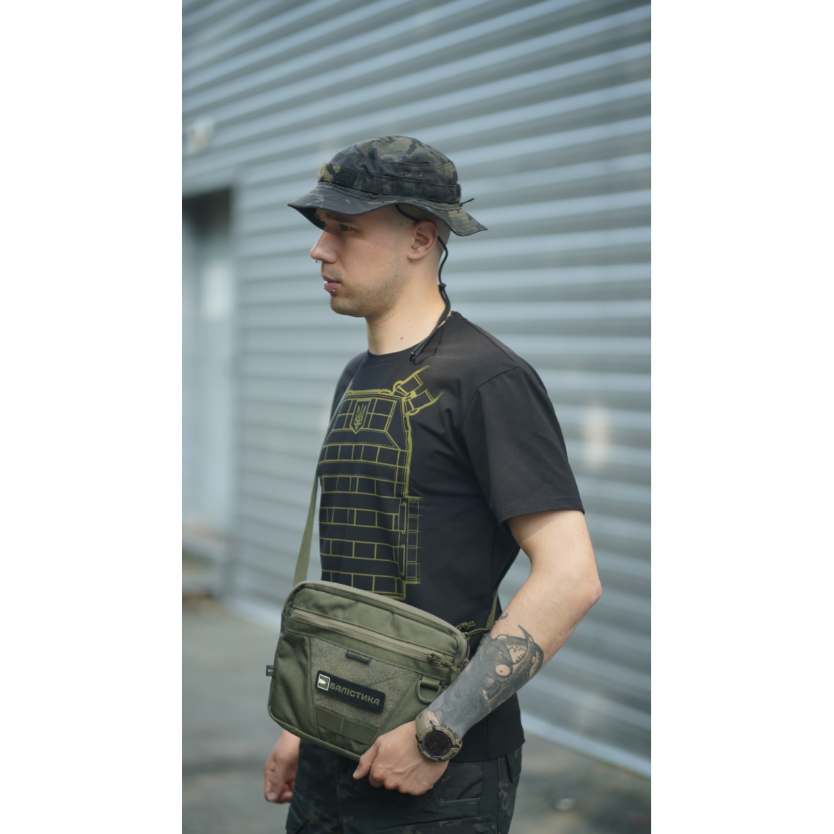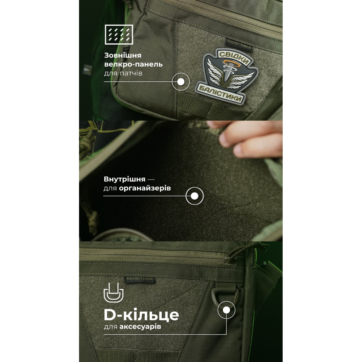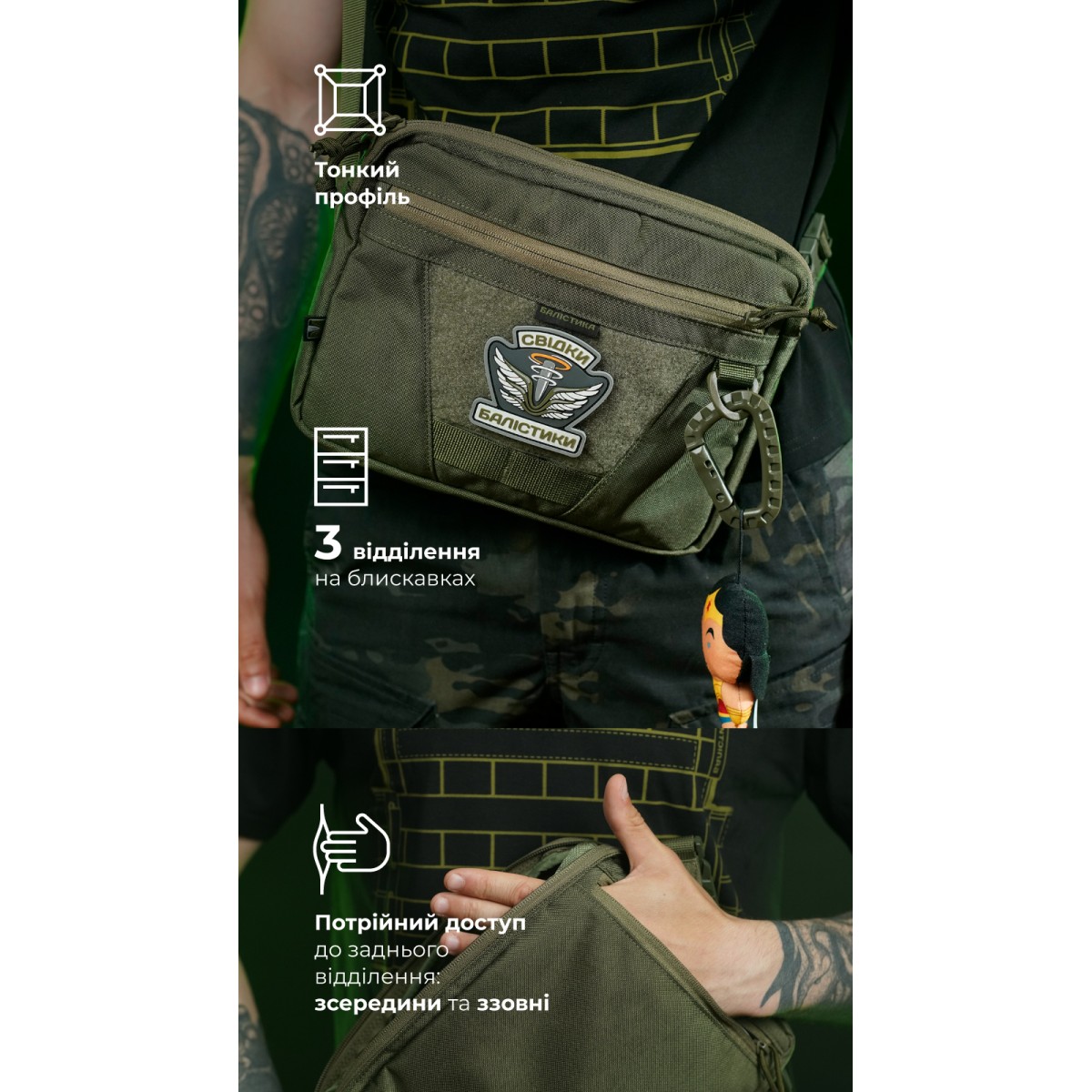 Компактна сумка через плече для щоденного носіння ✅ Ключові переваги Три відділення на блискавках для зручної організації речей Регульований ремінець із фастексом Потрійний доступ до заднього відділення Прозора кишеня з 2D-сітки Тренчик з карабіном для ключів Еластична манжета для мультитулів, ножів або ліхтариків Внутрішня велкро-панель для знімних органайзерів чи кобури Зовнішня велкро-панель для патчів D-кільце для підвісу аксесуарів Опис товару Тонка і легка сумка «Ташка» підійде для активних пересувань та перенесення найнеобхідніших дрібних речей. Складається з трьох відділень на блискавках. У передньому (27,5×20 см) є дві відкриті кишені (по 13×10 см). Також тут вшитий тренчик із карабіном – для кріплення ключів, перепусток тощо. Середнє, об’ємне відділення (27,5×21,5×3 см) оснащене прозорою кишенею (26×20 см) з 2D-сітки на передній стінці. Відділення замикається блискавкою з двома бігунками. ✔️ Над сітчастою кишенею розташована еластична манжета, у яку можна вкласти мультитул, складний ніж, ліхтарик або турнікет. ✔️ На задній стінці нашита велкро-панель (25,5×15,5 см), призначена для знімних органайзерів, кобур або тримачів, наприклад під газовий балончик. ✔️ Над панеллю вміщена блискавка, яка відкриває заднє відділення. Заднє відділення (26,5×21 см) зовні по краях оснащене ще двома вертикальними блискавками. Подвійний зовнішній доступ дає змогу швидко і легко діставати потрібні речі однією рукою (скажімо, телефон), навіть сидячи за кермом. ✔️ Сумка доповнена ремінцем зі стропи, який вшитий у бокові «крильця» під кутом – для зручнішого носіння через плече. Ремінець обладнаний фастексом для швидкого зняття та регулюється за довжиною. ✔️ На фасаді розміщена фігурна велкро-панель (17×9 см) для патчів і D-кільце для підвішування аксесуарів, брелоків. ✔️ Під велкро-панеллю розміщені дві чарунки моллі як додаткові кріплення. ❓ Часті запитання Чи підходить сумка для щоденного використання? Так, сумка чудово підходить для міста та повсякденних поїздок завдяки своїй компактності та функціональним відділенням. Навіщо у задньому відділенні три блискавки? Це дає змогу отримати доступ до вмісту з будь-якого положення. Водночас парні зовнішні блискавки дозволяють діставати необхідну річ «зручною» рукою. Як доглядати за сумкою? Її можна протирати вологою тканиною або м’якою губкою. Для глибшого очищення використовуйте воду та безфосфатний порошок, але уникайте агресивних хімічних засобів, щоб не пошкодити матеріал.Відгуки про Сумка через плече "Ташка" (Олива) ТМ Балістика