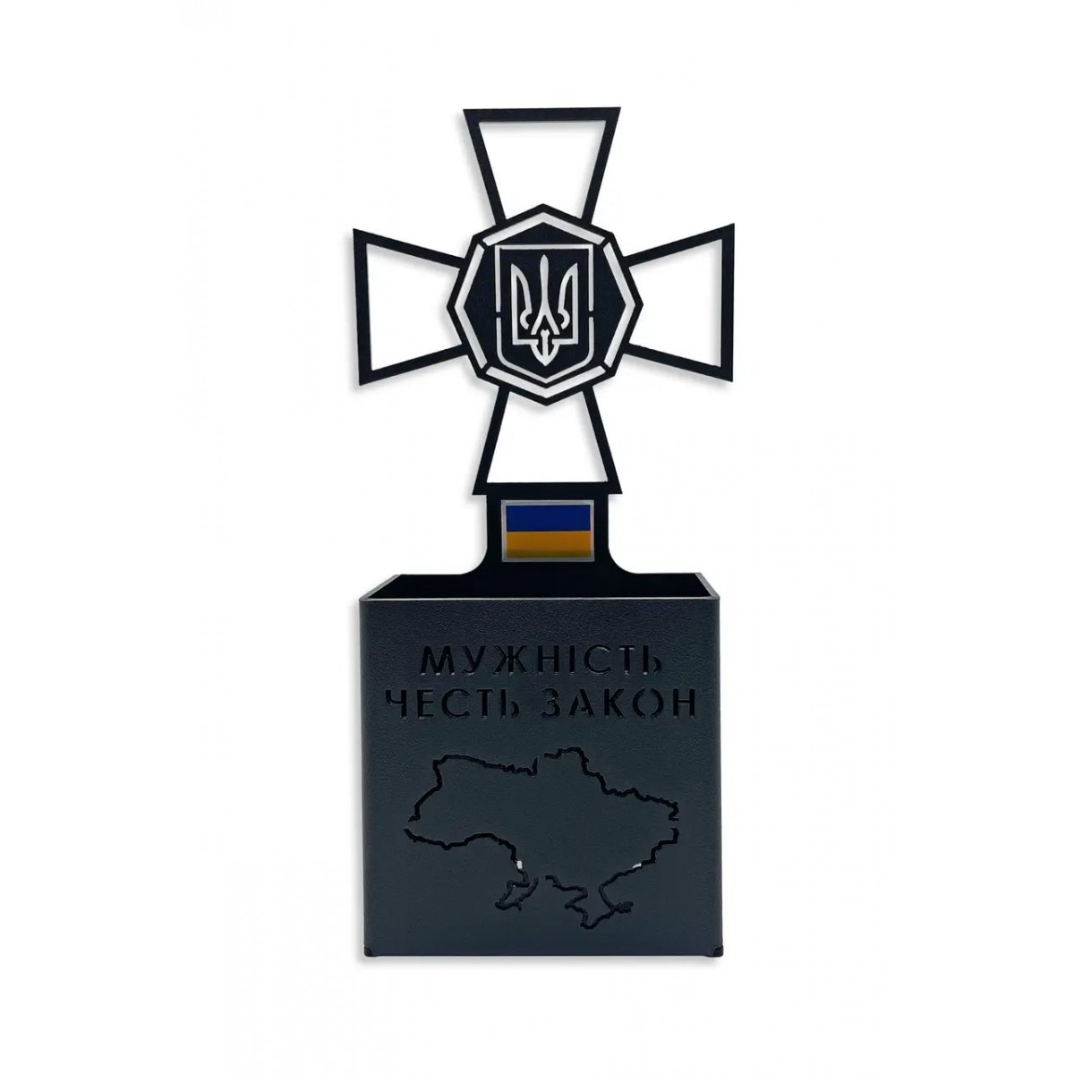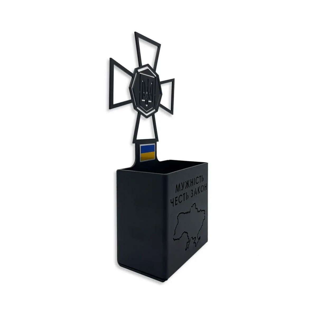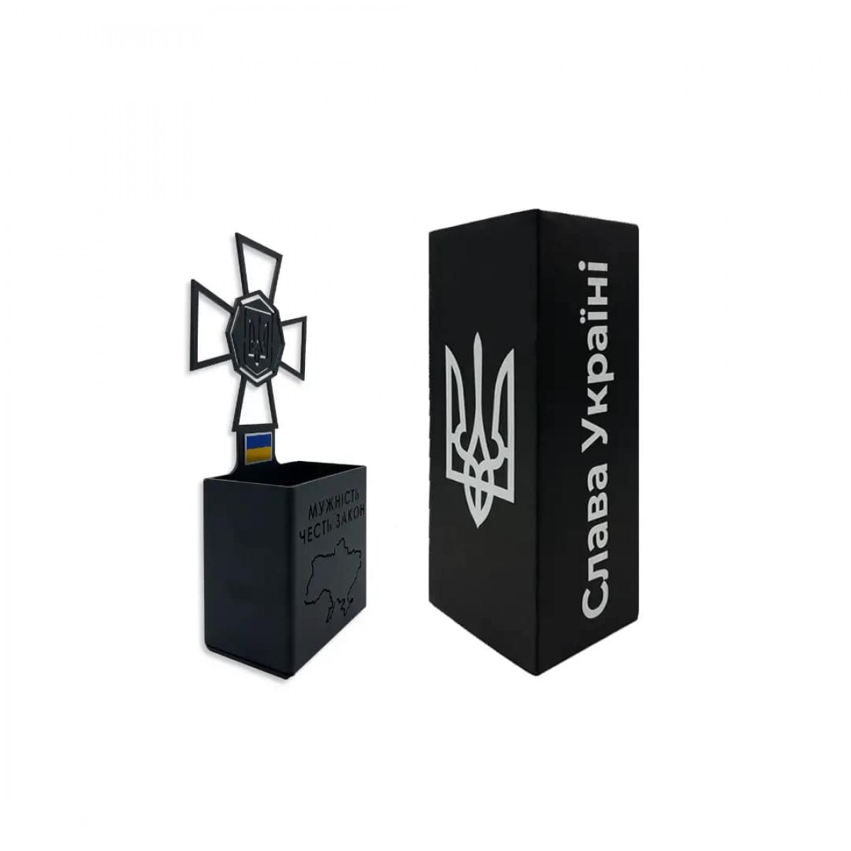 Підставка для канцелярії виконана з металу та оброблена порошковою текстурною фарбою. Гасло НГУ — Мужність, Честь, Закон ! Карта України та кольоровий прапор. Запаковано в подарункову коробку.