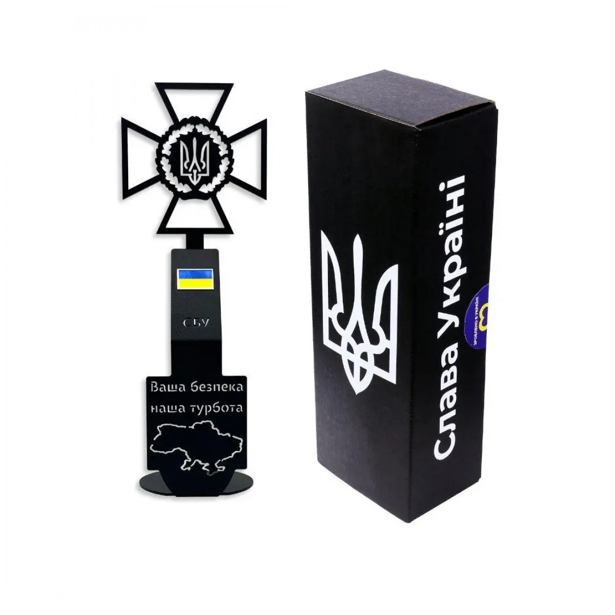 Статуетка СБУ "Служба безпеки України" - державний орган спеціального призначення з правоохоронними функціями, який забезпечує державну безпеку України. Підпорядкований Президенту України.На статуетці зображена емблема Служба безпеки України з гербом. Гасло СБУ — Ваша безпека-наша турбота. Карта України та кольоровий прапор. Запаковано в подарункову коробку.