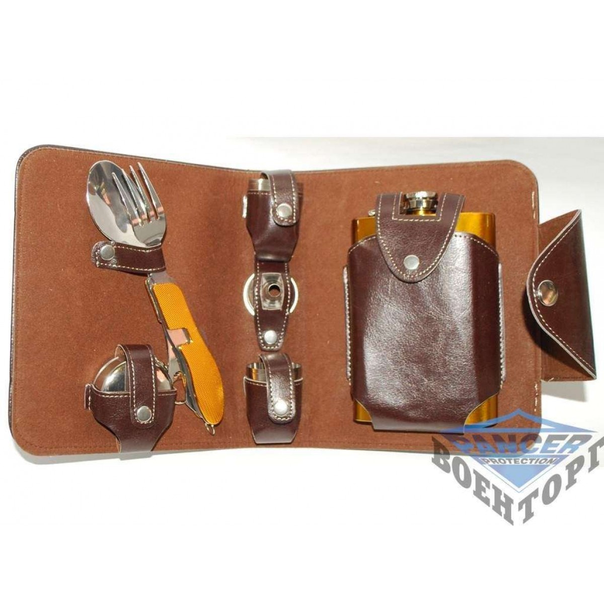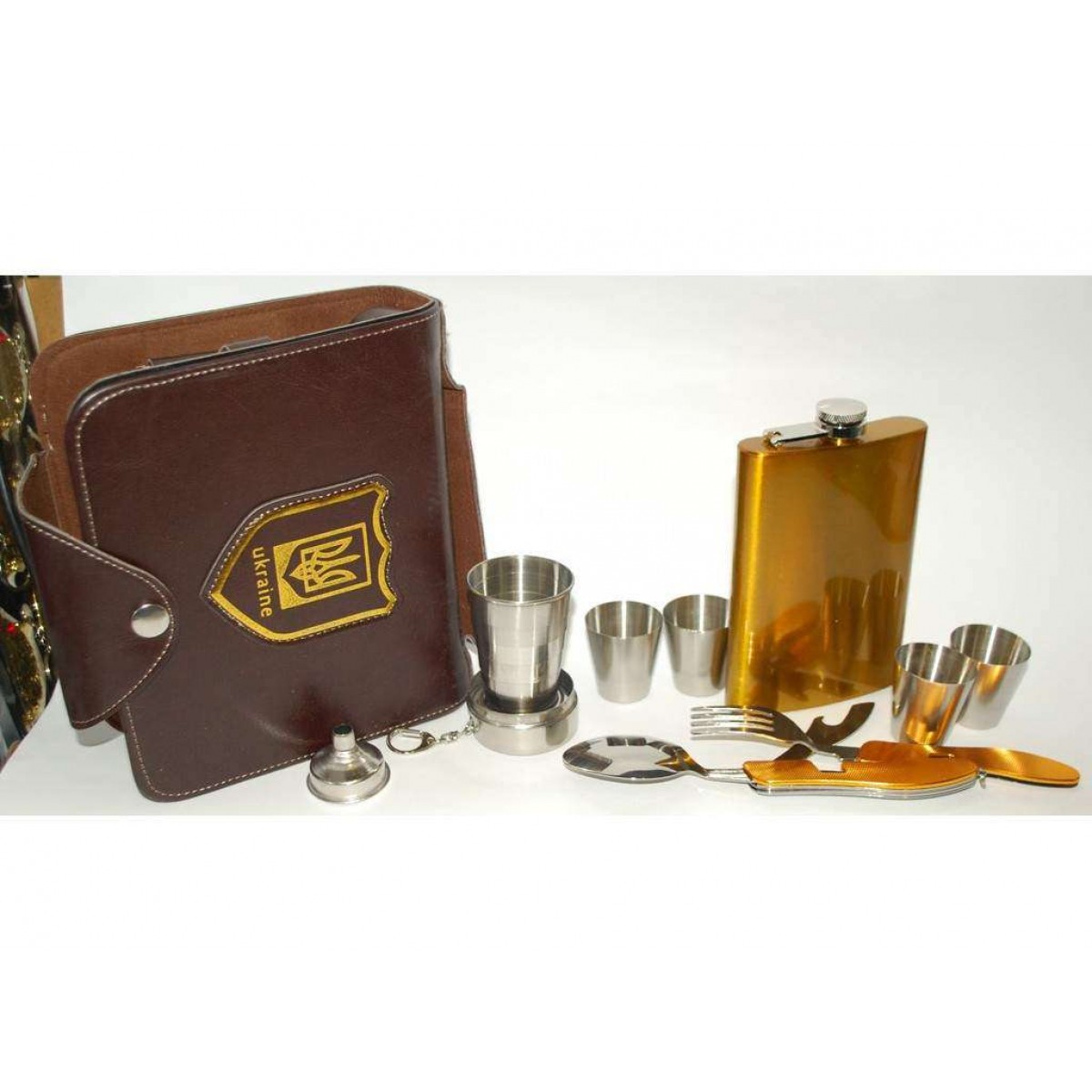 Набір з флягою в барсетці: фляга 270 мл, 4 стопки, 1 складаний склянку, лійка, 4 в 1 (ложка – вилка – відкривачка – ніж).