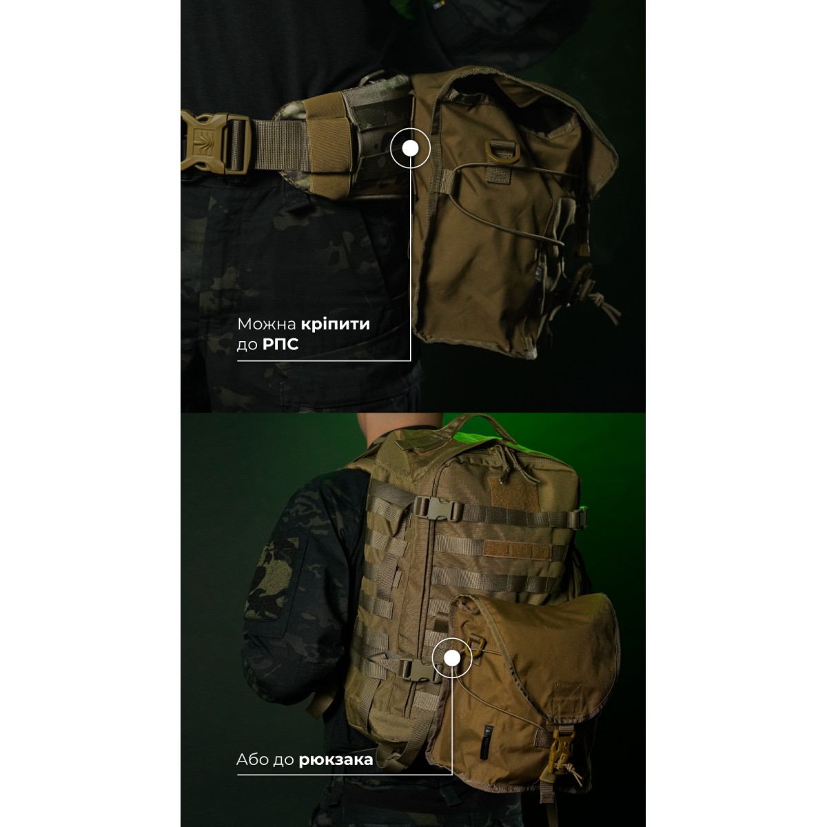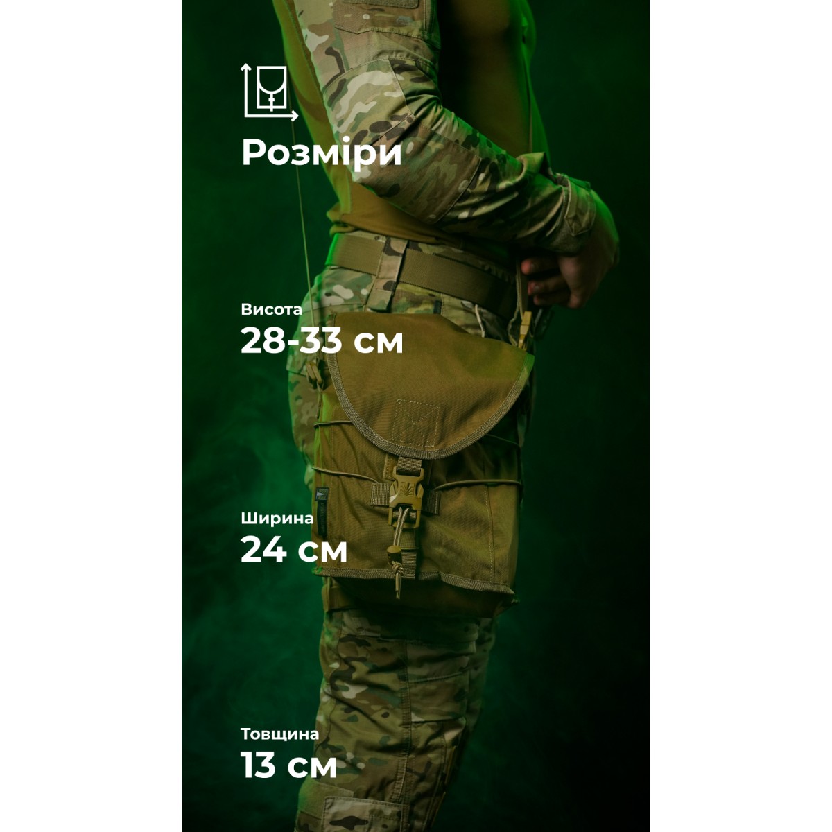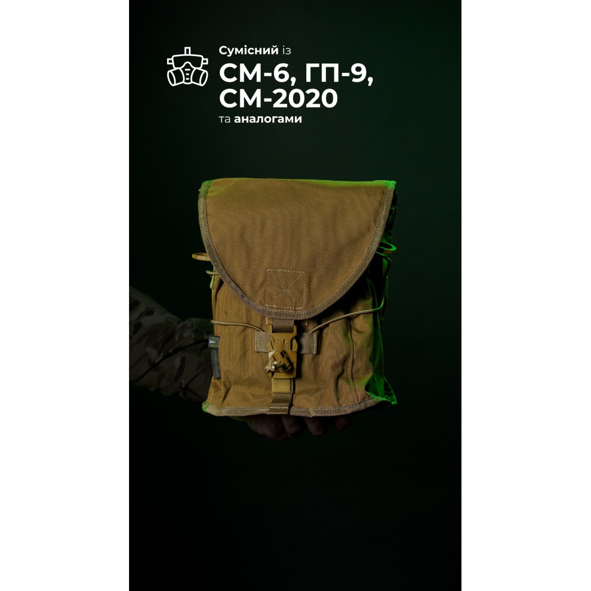 Легкий и крепкий подсумок для переноса противогаза и дополнительного фильтра. Совместим с противогазами СМ-6, ГП-9, СМ-2020 и другими похожими образцами. Может крепиться как подсумок или как сумка через плечо с дополнительной фиксацией к бедру. ✅ Ключевые преимущества Вмещает противогаз с установленным фильтром и еще одним запасным Может использоваться как утилитарный подсумок Крепится на молли или надевается через плечо Фиксируется ремешком к бедру, чтобы не болтаться во время движения Стягивается шоккордом для компактности Клапан регулируется под содержимое Два регулируемых ремня в комплекте Отверстие на дне для выхода влаги и мусора Выносливые материалы – нейлон 500D (аналог Cordura), Oxford 600D Надежная фурнитура – WJ (Южная Корея), АММ (Украина) Описание товара Подсумок состоит из единственного отделения, которое закрывается клапаном с фастексом и велкро. В комплект также входят два съемных регулируемых ремешка (100 и 210 см) с фастексами и двухщелевыми пряжками. Объем подсумка можно настроить благодаря регулировке клапана. Для этого липучку следует зафиксировать на нужном уровне и затянуть или ослабить стропу на фастексе. Подсумок можно закрепить на снаряжении на систему MOLLE. Он займет ширину 6 ячеек на вашей плитоноске/бронежилете, РПС или рюкзаке. Благодаря длинному ремешку его также можно носить через плечо. К боковинам пришиты D-кольца, к которым и можно прицепить длинный ремешок. Для этого двухщелевую пряжку на ремешке следует протянуть через D-кольцо. Снизу на задней стенке пришит туннель, сквозь который протягивается короткий ремешок для закрепления на бедре. Благодаря этому подсумок не болтается со стороны в сторону во время движения. Через фасад прошнурован шоккорд, которым можно стянуть пустой подсумок. В дне вырезано отверстие с металлическим люверсом, через которое выходит мелкий мусор, песок, влага. ❓ Часто задаваемые вопросы В этом подсумке можно переносить только противогаз? Нет, не только. В него можно положить сухой паек, гранаты, патроны насыпью и т. п. Регулируется ли длина ремешков? Да, при помощи двухщелевых пряжек длину ремешков можно настроить в соответствии с телосложением и объемом снаряжения на бойце. На более коротком ремешке дополнительно вшита эластичная стропа, которая обеспечивает плотное, но комфортное прилегание к ноге без давления. Свободные концы можно свернуть и закрепить велкро-хлястиком. Нужно ли снимать фильтр перед хранением в подсумке? Нет, нет нужды. В подсумке достаточно места, чтобы хранить противогаз сразу с установленным фильтром. Поэтому не придется тратить время на его присоединение прямо на позиции.Отзывы о Подсумок под противогаз "Ветровик" (Койот) ТМ Баллистика