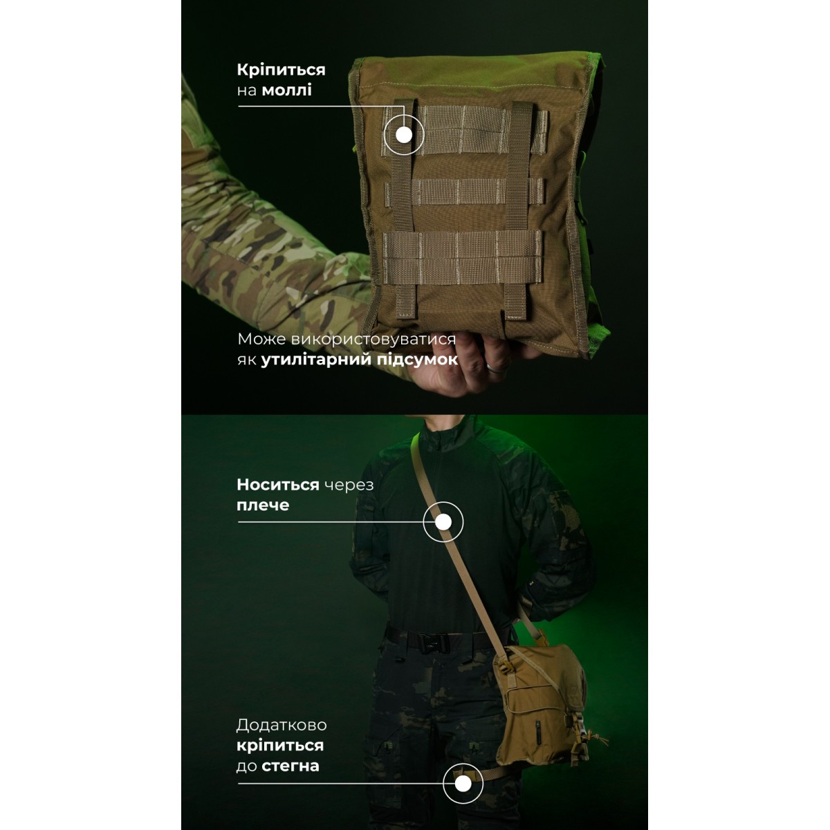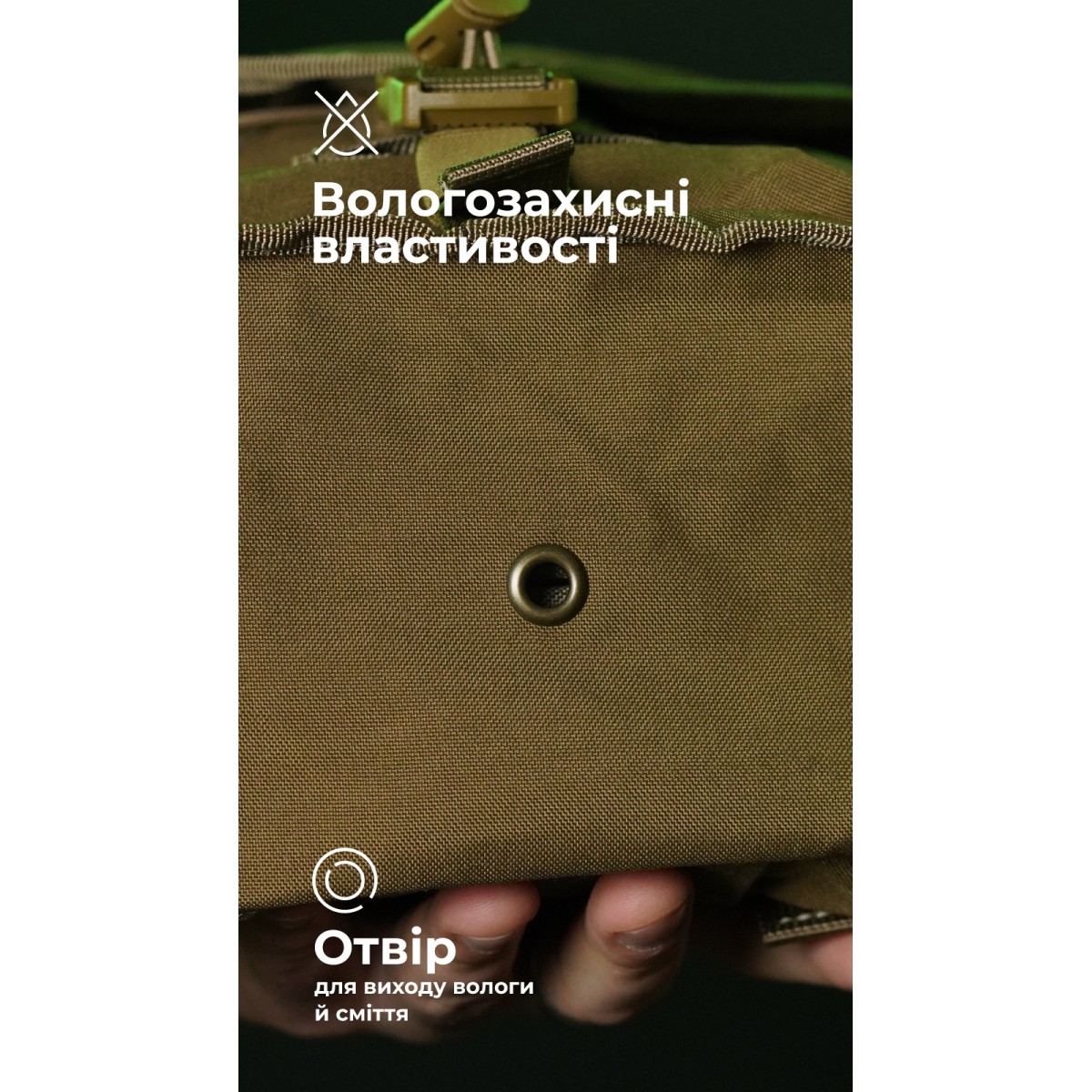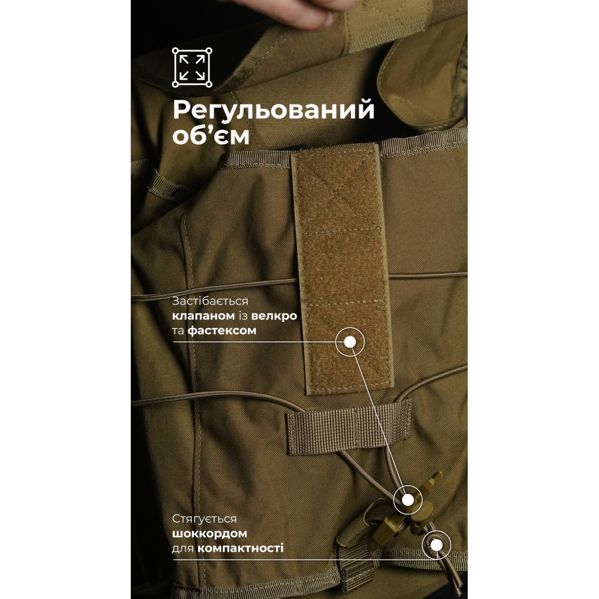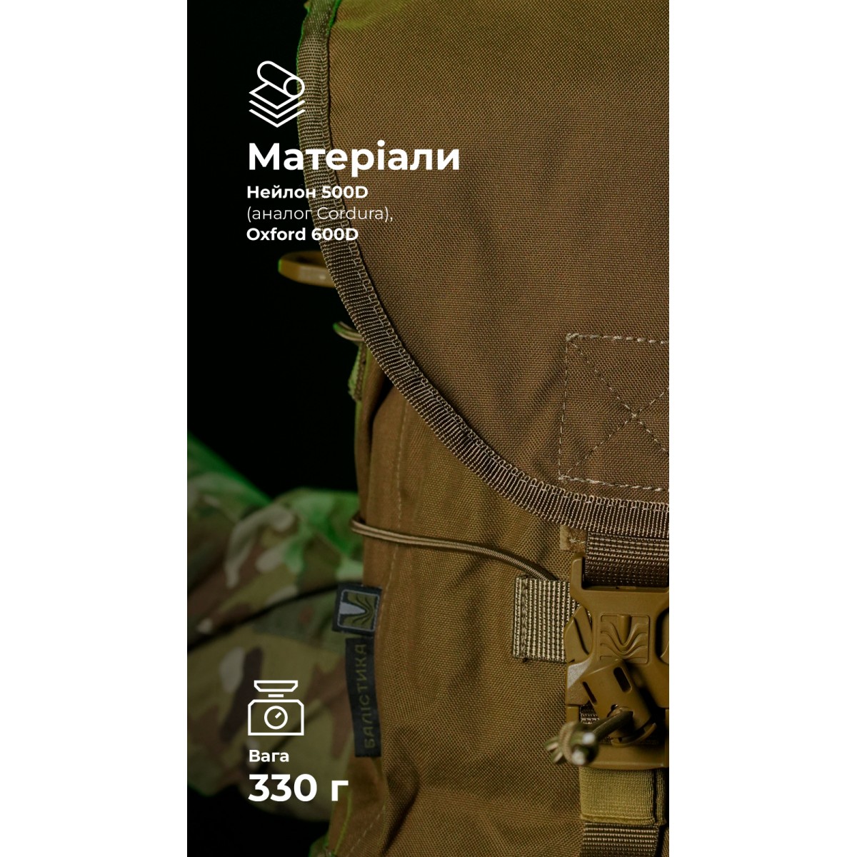 Легкий и крепкий подсумок для переноса противогаза и дополнительного фильтра. Совместим с противогазами СМ-6, ГП-9, СМ-2020 и другими похожими образцами. Может крепиться как подсумок или как сумка через плечо с дополнительной фиксацией к бедру. ✅ Ключевые преимущества Вмещает противогаз с установленным фильтром и еще одним запасным Может использоваться как утилитарный подсумок Крепится на молли или надевается через плечо Фиксируется ремешком к бедру, чтобы не болтаться во время движения Стягивается шоккордом для компактности Клапан регулируется под содержимое Два регулируемых ремня в комплекте Отверстие на дне для выхода влаги и мусора Выносливые материалы – нейлон 500D (аналог Cordura), Oxford 600D Надежная фурнитура – WJ (Южная Корея), АММ (Украина) Описание товара Подсумок состоит из единственного отделения, которое закрывается клапаном с фастексом и велкро. В комплект также входят два съемных регулируемых ремешка (100 и 210 см) с фастексами и двухщелевыми пряжками. Объем подсумка можно настроить благодаря регулировке клапана. Для этого липучку следует зафиксировать на нужном уровне и затянуть или ослабить стропу на фастексе. Подсумок можно закрепить на снаряжении на систему MOLLE. Он займет ширину 6 ячеек на вашей плитоноске/бронежилете, РПС или рюкзаке. Благодаря длинному ремешку его также можно носить через плечо. К боковинам пришиты D-кольца, к которым и можно прицепить длинный ремешок. Для этого двухщелевую пряжку на ремешке следует протянуть через D-кольцо. Снизу на задней стенке пришит туннель, сквозь который протягивается короткий ремешок для закрепления на бедре. Благодаря этому подсумок не болтается со стороны в сторону во время движения. Через фасад прошнурован шоккорд, которым можно стянуть пустой подсумок. В дне вырезано отверстие с металлическим люверсом, через которое выходит мелкий мусор, песок, влага. ❓ Часто задаваемые вопросы В этом подсумке можно переносить только противогаз? Нет, не только. В него можно положить сухой паек, гранаты, патроны насыпью и т. п. Регулируется ли длина ремешков? Да, при помощи двухщелевых пряжек длину ремешков можно настроить в соответствии с телосложением и объемом снаряжения на бойце. На более коротком ремешке дополнительно вшита эластичная стропа, которая обеспечивает плотное, но комфортное прилегание к ноге без давления. Свободные концы можно свернуть и закрепить велкро-хлястиком. Нужно ли снимать фильтр перед хранением в подсумке? Нет, нет нужды. В подсумке достаточно места, чтобы хранить противогаз сразу с установленным фильтром. Поэтому не придется тратить время на его присоединение прямо на позиции.Отзывы о Подсумок под противогаз "Ветровик" (Койот) ТМ Баллистика