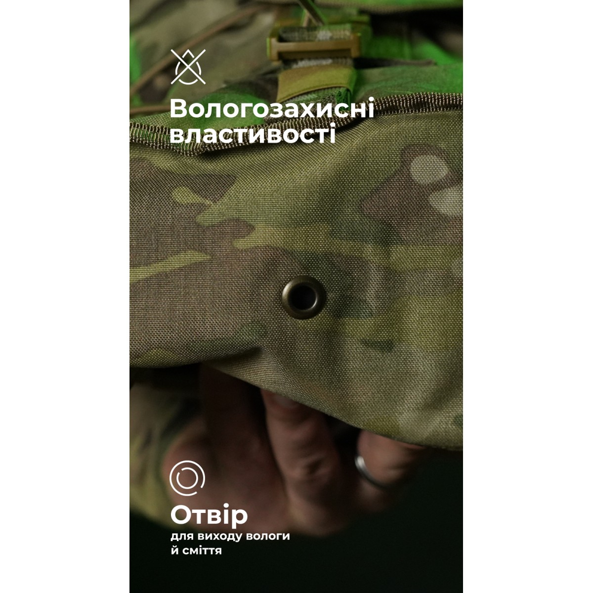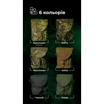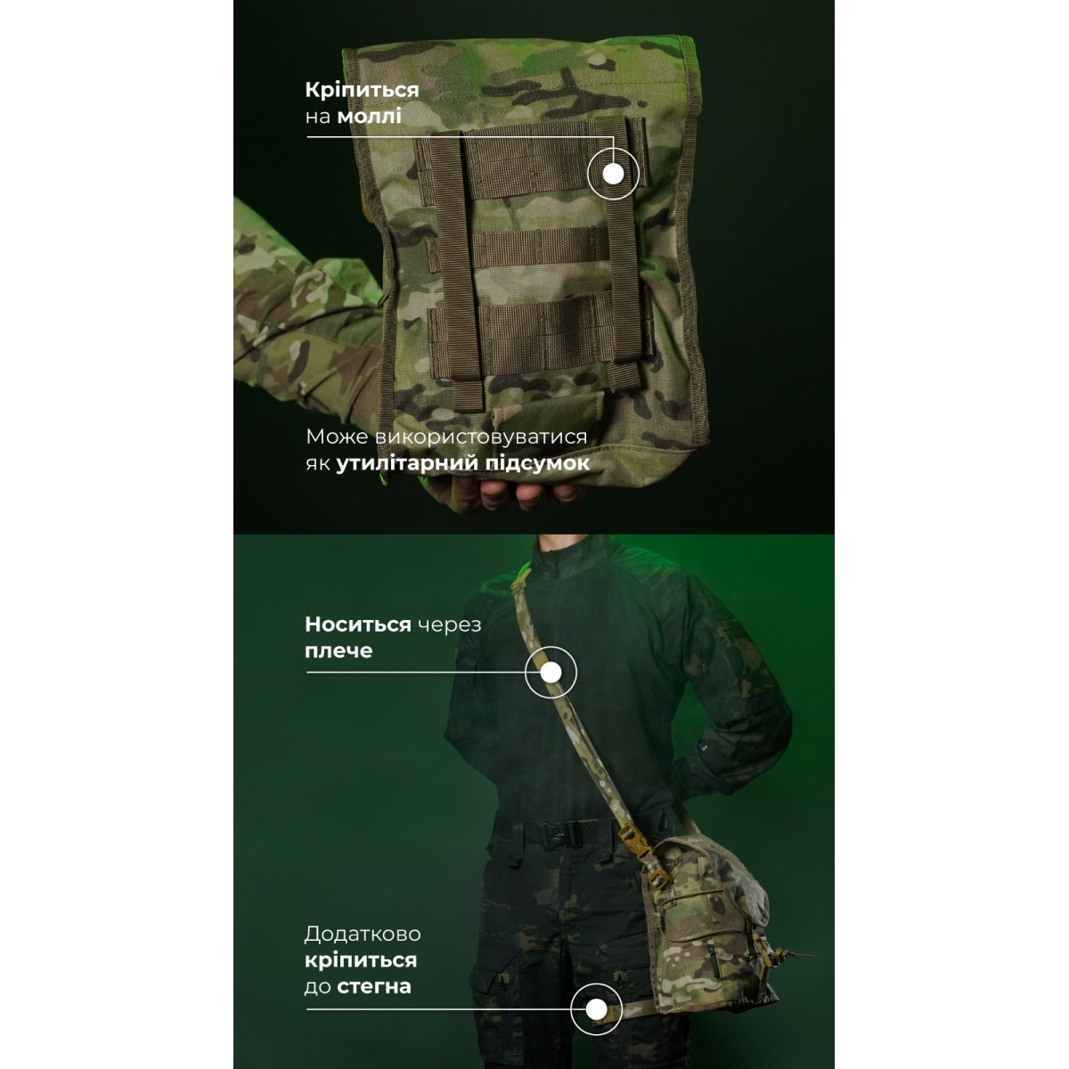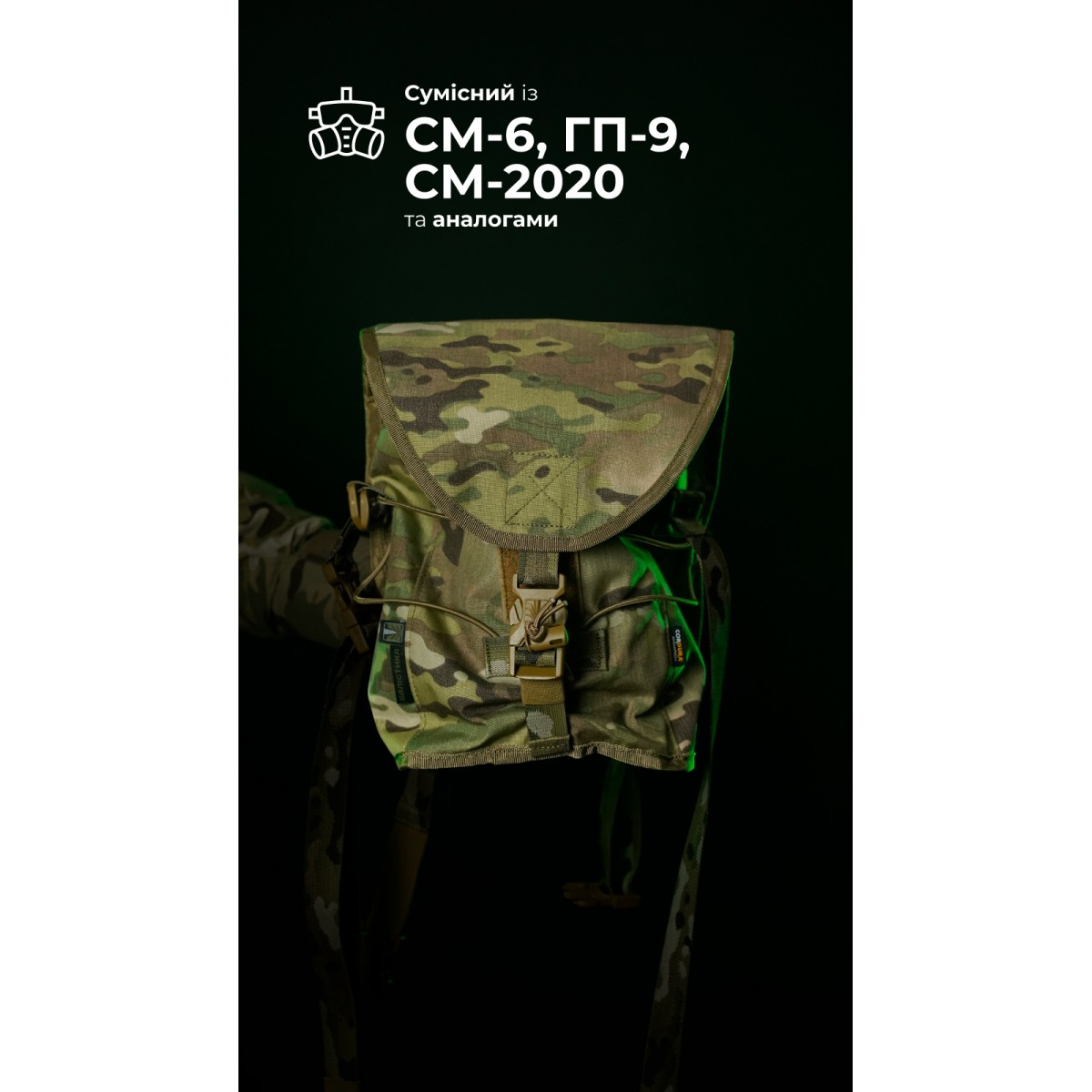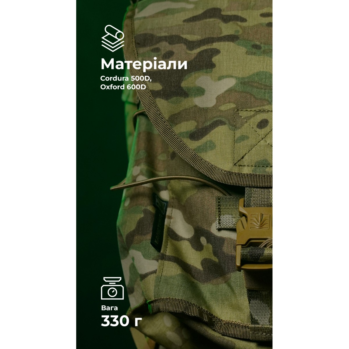 Легкий и крепкий подсумок для переноса противогаза и дополнительного фильтра. Совместим с противогазами СМ-6, ГП-9, СМ-2020 и другими похожими образцами. Может крепиться как подсумок или как сумка через плечо с дополнительной фиксацией к бедру. ✅ Ключевые преимущества Вмещает противогаз с установленным фильтром и еще одним запасным Может использоваться как утилитарный подсумок Крепится на молли или надевается через плечо Фиксируется ремешком к бедру, чтобы не болтаться во время движения Стягивается шоккордом для компактности Клапан регулируется под содержимое Два регулируемых ремня в комплекте Отверстие на дне для выхода влаги и мусора Выносливые материалы – нейлон 500D (аналог Cordura), Oxford 600D Надежная фурнитура – WJ (Южная Корея), АММ (Украина) Описание товара Подсумок состоит из единственного отделения, которое закрывается клапаном с фастексом и велкро. В комплект также входят два съемных регулируемых ремешка (100 и 210 см) с фастексами и двухщелевыми пряжками. Объем подсумка можно настроить благодаря регулировке клапана. Для этого липучку следует зафиксировать на нужном уровне и затянуть или ослабить стропу на фастексе. Подсумок можно закрепить на снаряжении на систему MOLLE. Он займет ширину 6 ячеек на вашей плитоноске/бронежилете, РПС или рюкзаке. Благодаря длинному ремешку его также можно носить через плечо. К боковинам пришиты D-кольца, к которым и можно прицепить длинный ремешок. Для этого двухщелевую пряжку на ремешке следует протянуть через D-кольцо. Снизу на задней стенке пришит туннель, сквозь который протягивается короткий ремешок для закрепления на бедре. Благодаря этому подсумок не болтается со стороны в сторону во время движения. Через фасад прошнурован шоккорд, которым можно стянуть пустой подсумок. В дне вырезано отверстие с металлическим люверсом, через которое выходит мелкий мусор, песок, влага. ❓ Часто задаваемые вопросы В этом подсумке можно переносить только противогаз? Нет, не только. В него можно положить сухой паек, гранаты, патроны насыпью и т. п. Регулируется ли длина ремешков? Да, при помощи двухщелевых пряжек длину ремешков можно настроить в соответствии с телосложением и объемом снаряжения на бойце. На более коротком ремешке дополнительно вшита эластичная стропа, которая обеспечивает плотное, но комфортное прилегание к ноге без давления. Свободные концы можно свернуть и закрепить велкро-хлястиком. Нужно ли снимать фильтр перед хранением в подсумке? Нет, нет нужды. В подсумке достаточно места, чтобы хранить противогаз сразу с установленным фильтром. Поэтому не придется тратить время на его присоединение прямо на позиции.Отзывы о Подсумок под противогаз "Ветровик" (Мультикам) ТМ Баллистика