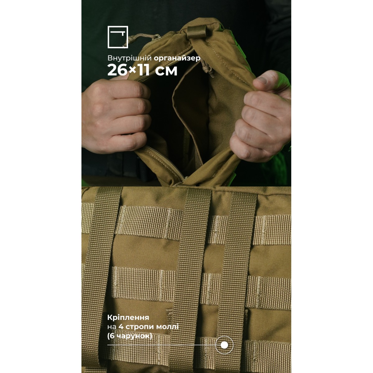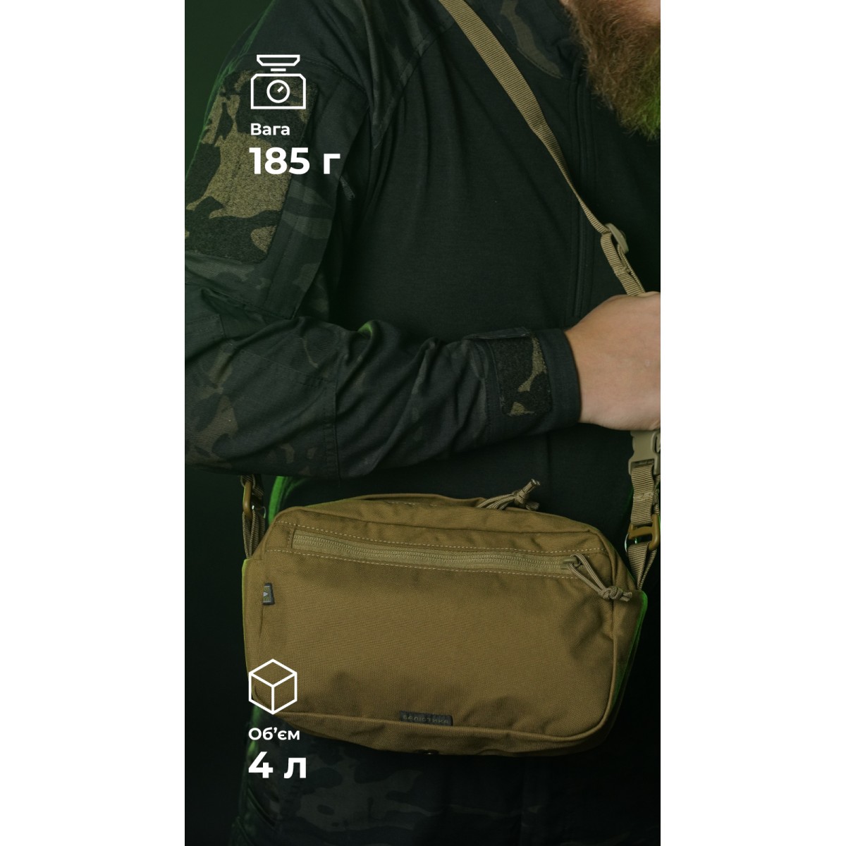 Вместительный и выносливый подсумок подходит для организованного хранения мелкого снаряжения, инвентаря, боеприпасов, провизии ✅ Ключевые преимущества Большой объем (4 л) Основное отделение + фронтальный карман на молнии Внутри открытый карман-органайзер Защита от влаги: клапан на молнии + влагоотталкивающая пропитка + дренажное отверстие Крепление на 4 стропы молли Швы, обработанные тесьмой для выносливости Прочные материалы: нейлон 500D (аналог Cordura), Oxford 600D Качественные молнии YKK (Япония) Описание товара Благодаря максимально простой конструкции подсумок облегчает доступ к содержимому. А выносливые материалы, надежные швы и фурнитура обеспечивают стойкость к износу и повреждениям. Подсумок состоит из одного просторного основного отделения. Оно замыкается на молнию с двумя бегунками. Внутри есть один открытый карман с невысоким бортиком (26×11 см). Спереди на подсумке помещен внешний карман (26×16 см) на молнии. ✔️ Материалы с водоотталкивающей пропиткой обеспечивают базовую защиту содержимого от дождя. ✔️ Внизу вырезано отверстие с металлическим люверсом, через которое может выходить лишняя влага и мелкий мусор. ✔️ Молния на основном отделении закрыта клапаном для защиты от влаги и случайного открытия. С обоих ее краев пришиты петли для более удобного открывания. ✔️ Крепится к снаряжению на 4 стропы молли, занимает ширину в 6 ячеек. ✔️ Внутренние швы обработаны тесьмой для большей выносливости. ❓ Часто задаваемые вопросы Какой объем имеет подсумок и что туда вмещается? Подсумок объемом 4 л легко вместит 9 магазинов на 30 патронов AK/AR или боекомплект россыпью. Также в нем можно хранить перчатки, блокнот, карту или сухпай. Держит ли форму, когда пустой? Нет, подсумок выполнен из гибких тканей, без жестких вставок или демпферов, поэтому легко сворачивается и не занимает много места среди вещей. Обязательно ли шнуровать результат на снаряжение, чтобы эффективно его использовать? Нет, не обязательно. Вы можете использовать его как сумку для негабаритных вещей, которая будет храниться в вашем рюкзаке или отдельно. Станет хорошим дополнением к РБИ или другому рюкзаку, чтобы увеличить его объем. Можно ли использовать подсумок для активного отдыха? Да, конечно. «Припасник» хорошо подойдет для активного отдыха. В нем можно разместить контейнеры для еды или дополнительное снаряжение, которое пригодится вам в путешествии.Отзывы о Утилитарный подсумок "Припасник" (Горизонтальный | 16,5 х 27,5 см | Койот) ТМ Баллистика