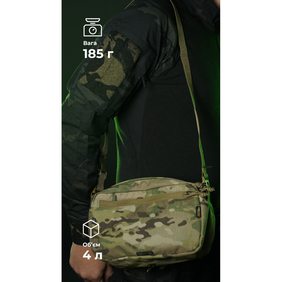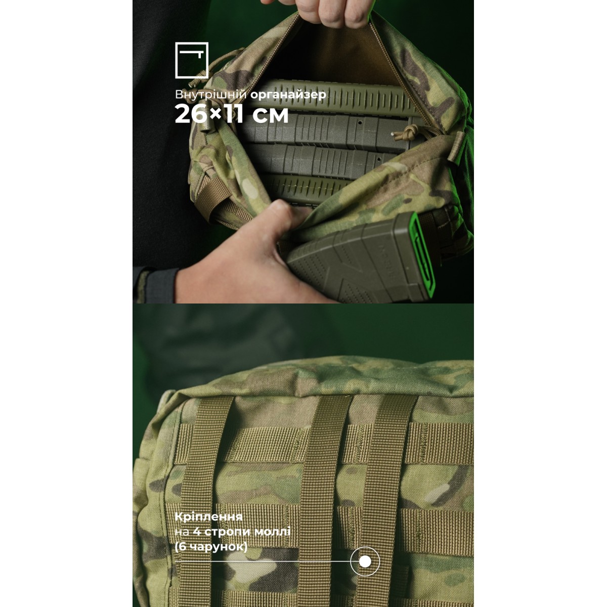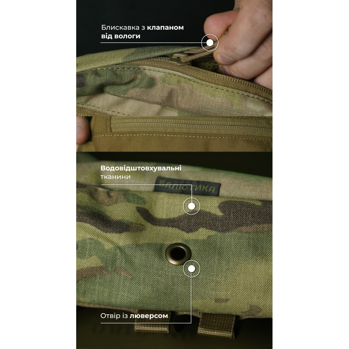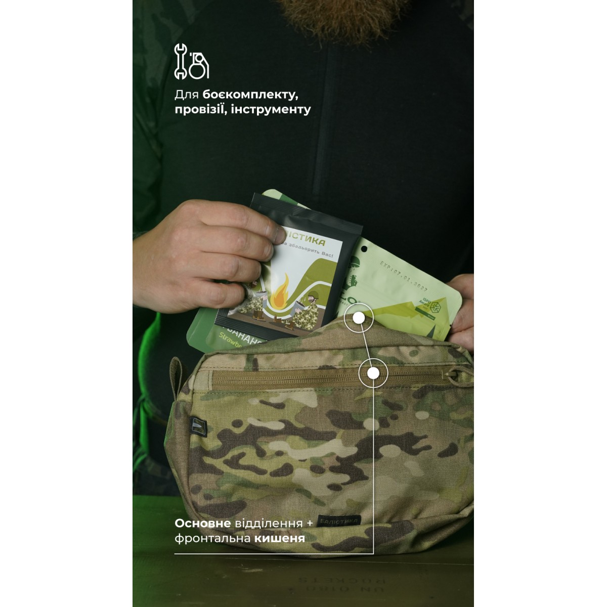Вместительный и выносливый подсумок подходит для организованного хранения мелкого снаряжения, инвентаря, боеприпасов, провизии ✅ Ключевые преимущества Большой объем (4 л) Основное отделение + фронтальный карман на молнии Внутри открытый карман-органайзер Защита от влаги: клапан на молнии + влагоотталкивающая пропитка + дренажное отверстие Крепление на 4 стропы молли Швы, обработанные тесьмой для выносливости Прочные материалы: Cordura 500D, Oxford 600D Качественные молнии YKK (Япония) Описание товара Благодаря максимально простой конструкции подсумок облегчает доступ к содержимому. А выносливые материалы, надежные швы и фурнитура обеспечивают стойкость к износу и повреждениям. Подсумок состоит из одного просторного основного отделения. Оно замыкается на молнию с двумя бегунками. Внутри есть один открытый карман с невысоким бортиком (26×11 см). Спереди на подсумке помещен внешний карман (26×16 см) на молнии. ✔️ Материалы с водоотталкивающей пропиткой обеспечивают базовую защиту содержимого от дождя. ✔️ Внизу вырезано отверстие с металлическим люверсом, через которое может выходить лишняя влага и мелкий мусор. ✔️ Молния на основном отделении закрыта клапаном для защиты от влаги и случайного открытия. С обоих ее краев пришиты петли для более удобного открывания. ✔️ Крепится к снаряжению на 4 стропы молли, занимает ширину в 6 ячеек. ✔️ Внутренние швы обработаны тесьмой для большей выносливости. ❓ Часто задаваемые вопросы Какой объем имеет подсумок и что туда вмещается? Подсумок объемом 4 л легко вместит 9 магазинов на 30 патронов AK/AR или боекомплект россыпью. Также в нем можно хранить перчатки, блокнот, карту или сухпай. Держит ли форму, когда пустой? Нет, подсумок выполнен из гибких тканей, без жестких вставок или демпферов, поэтому легко сворачивается и не занимает много места среди вещей. Обязательно ли шнуровать результат на снаряжение, чтобы эффективно его использовать? Нет, не обязательно. Вы можете использовать его как сумку для негабаритных вещей, которая будет храниться в вашем рюкзаке или отдельно. Станет хорошим дополнением к РБИ или другому рюкзаку, чтобы увеличить его объем. Можно ли использовать подсумок для активного отдыха? Да, конечно. «Припасник» хорошо подойдет для активного отдыха. В нем можно разместить контейнеры для еды или дополнительное снаряжение, которое пригодится вам в путешествии.Отзывы о Утилитарный подсумок "Припасник" (Горизонтальный | 16,5 х 27,5 см | Мультикам) ТМ Баллистика
