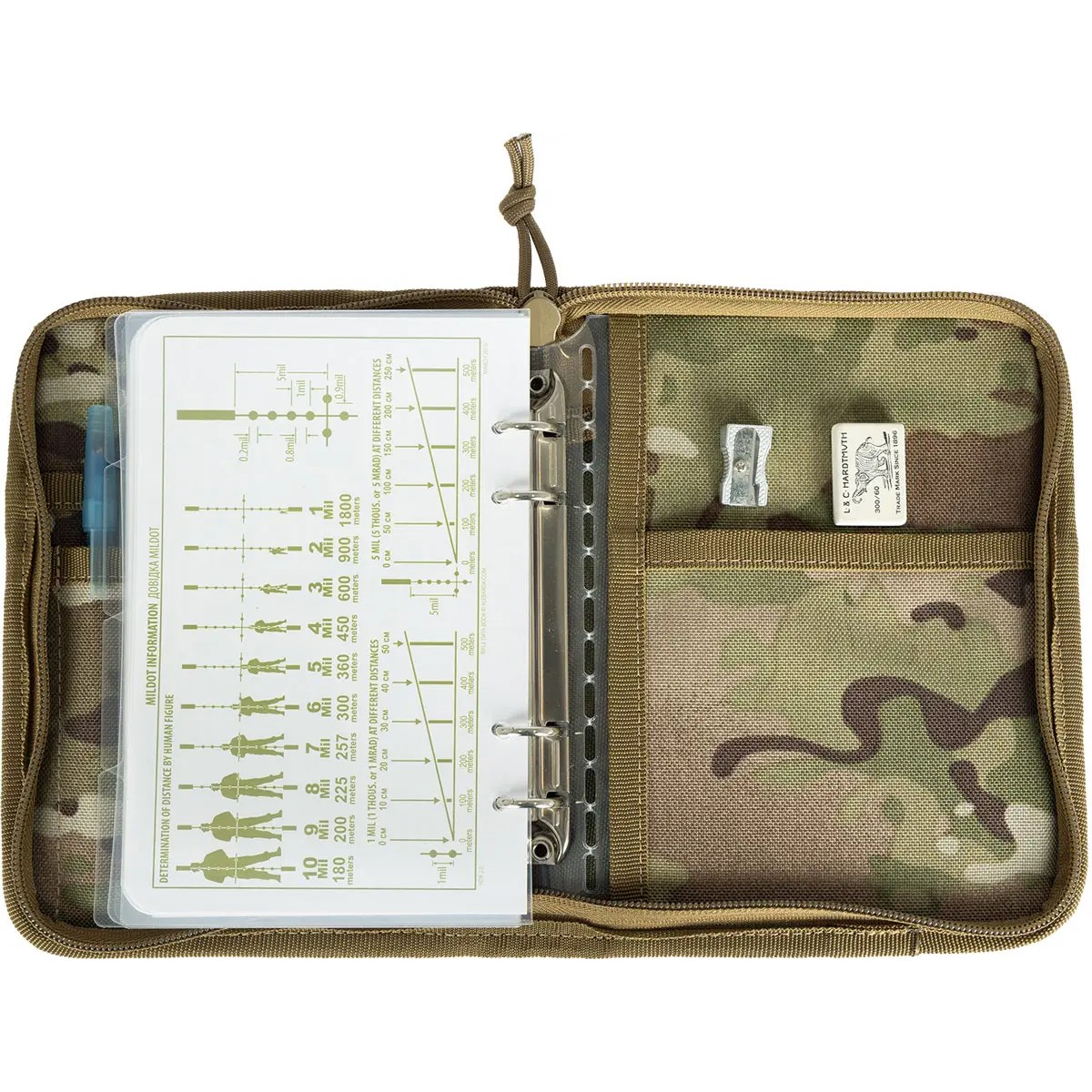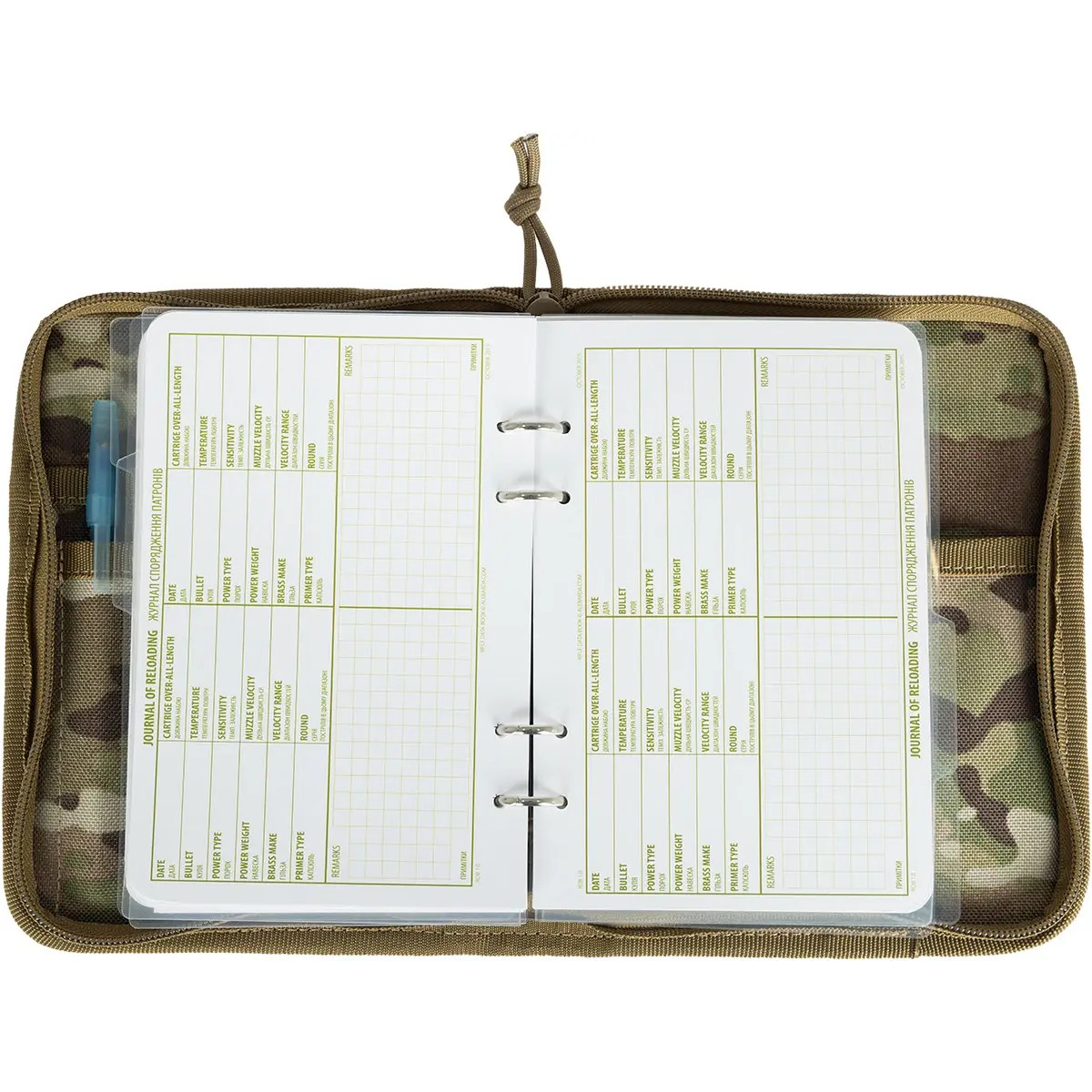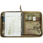 Сам блокнот, в виде пластиковой папки с финским кольцевым механизмом, фиксируется в прочном чехле из CORDURA.