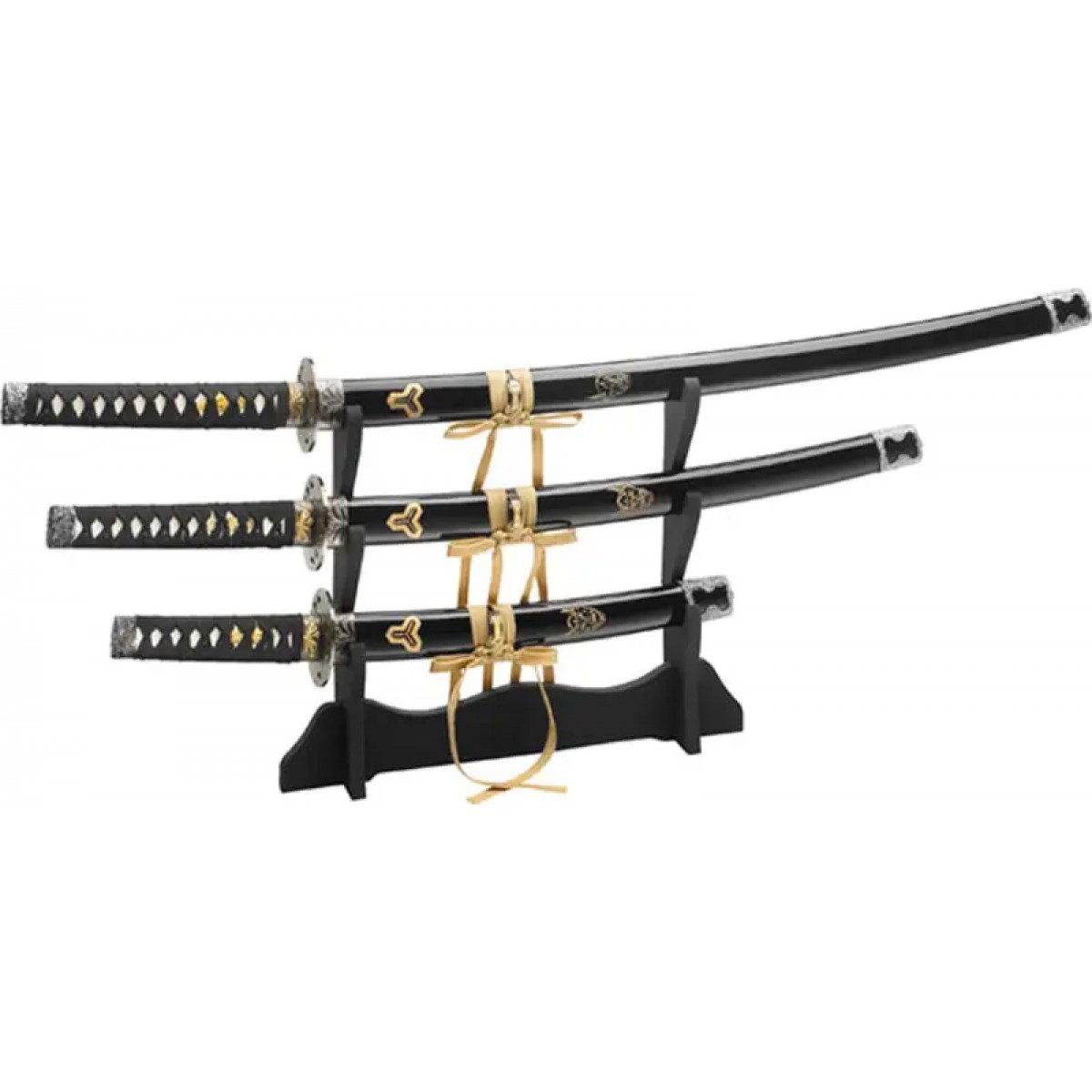 Коллекция состоит из трех канонических мечей самураев – катаны, вакидзаси и танто. Все они изготовлены в лучших японских традициях. Клинки изготовлены из углеродистой стали с декоративной заточкой. Рукоятки традиционно имеют намотку из кожи ската, декоративные мэнуки (специальные вставки) и декоративные литые тсюбы (гарды). К каждому мечу имеются деревянные лакированные ножны с узорным орнаментом.