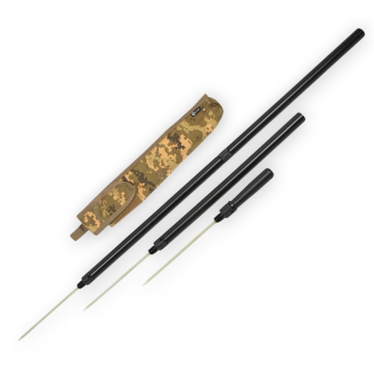 Жала изготовлены из диэлектрического материала, что позволяет снизить риск возникновения электрической искры при контакте с электронными элементами мин. Щуп легко разбирается на секции для удобной транспортировки. Чехол обеспечивает дополнительную защиту при хранении и переноске.