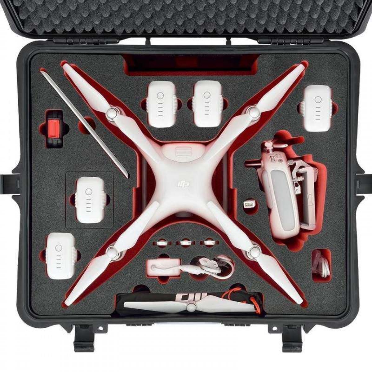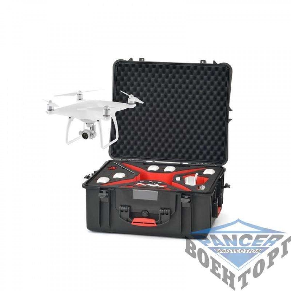 Это водонепроницаемый жесткий кейс для DJI Phantom собранный на основе серии HPRC2710 и укомплектован наполнителем из пены высокой плотности, в которой вырезаны отделы специально под:
